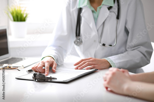 Close up of doctor and patient sitting at the desk near the window in hospital