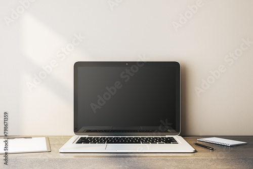 laptop, screen, mock, up, sunlight, wooden, desk, three-dimensional, rendering, monitor, display, desktop, top, table, closeup, close, notebook, book, mobile, supply, blank, empty, template, place, space, layout, copy, clean, network, technology, concept, background, illustration, datum, daylight, portable, computer, work, office, nobody, communication, view, corporate, wall, concrete, tech, workspace