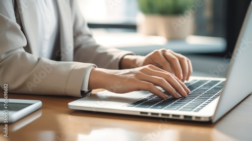 Close up of female hands typing on laptop keyboard at table or desk in the office, Businessman working in front of laptop on table,Work online or do business online in front of your laptop.
