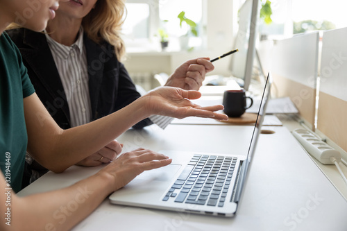 Close up of female office employees sit at desk working on laptop discussing business project together, businesswomen cooperate consider financial company ideas using computer gadget at workplace