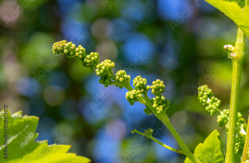 Close up of fruit Buds inflorescences of white grapes just before flowering in late spring