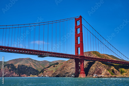 Close up of Golden Gate Bridge with bright summer day with blue skies and choppy bay waters