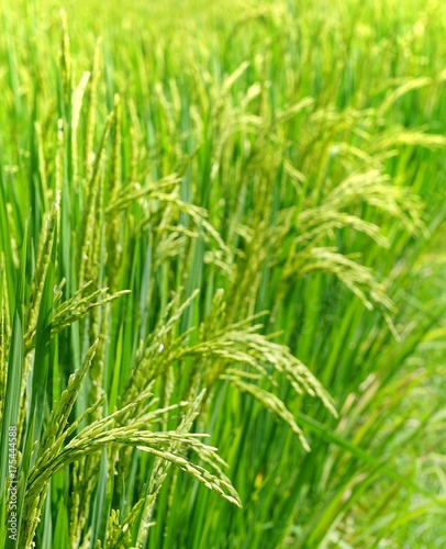 Close up of green paddy rice. Green ear of rice in paddy rice field