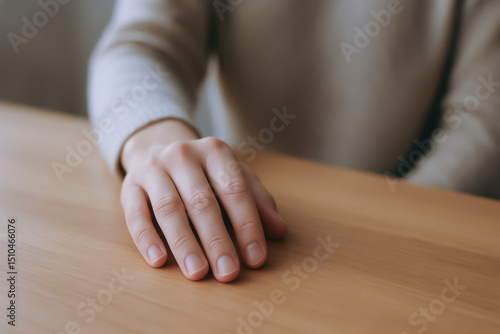 hand, human, finger, skin, palm, wooden, table, resting, calm, gentle, support, emotional, intelligence, person, adult, casual attire, natural, light, indoor, closeup, detail, relaxation, comfort, peaceful, fingernail, sleeve, beige, soft, quiet, still, gesture, connection, touch, warmth, care, health, therapy, mindfulness, sharpened, simplicity