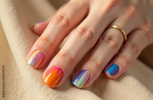 closeup, hand, rainbow, manicure, nail, polish, colourful, bright, vibrant, cheerful, modern, fashion, beauty, stylish, summer, artistic, design, creative, youth, pride, celebration, diversity, freedom, love, equality, bold, statement, trendy, fresh, playful, fun, glossy, detailed, aesthetic, decorative, finger, care, woman, hand, nail, salon