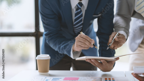 Close up of hands business people working together in boardroom, brainstorming, discussing and analyzing and planning business strategy.