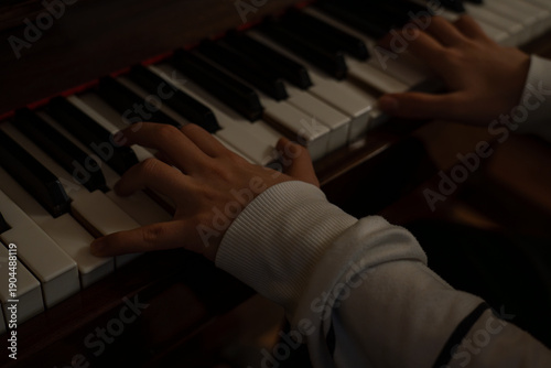 Close up of hands playing piano with moody lighting and artistic grain.