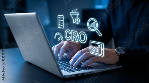 Close up of hands typing on a modern laptop keyboard while illustrating digital conversion rate optimization strategy icons glowing.