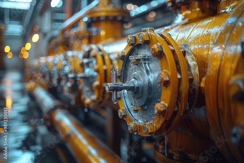 Close up of industrial gas equipment reactor fragment and steel components in engineering