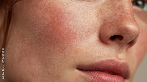 Close up of irritated skin on female face with redness and rosacea