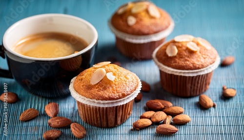Close Up Of Muffins With Almonds Coffee Cup And Coffee Beans