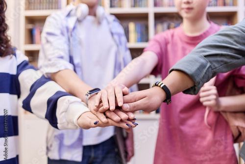 Close up of multiethnic group of students stacking hands in school library and huddling in unity copy space