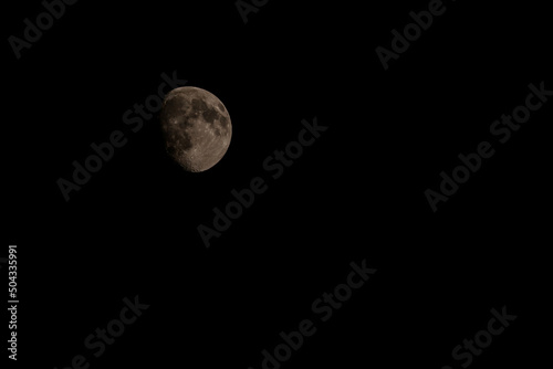 Close up of new moon with visible craters on its surface on black night sky background with copy space