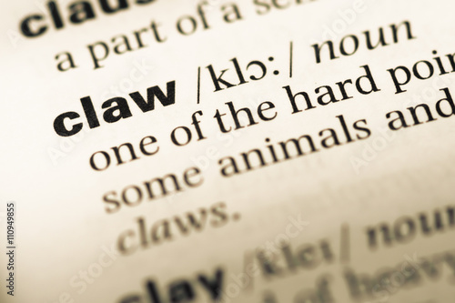 Close up of old English dictionary page with word claw
