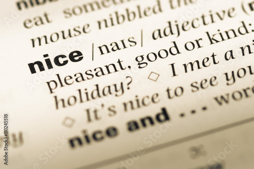 Close up of old English dictionary page with word nice
