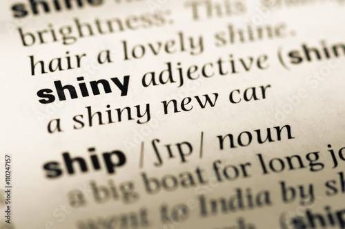 Close up of old English dictionary page with word shiny