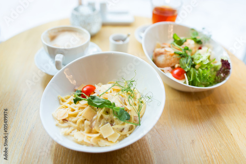 close up of pasta in bowl on table at restaurant