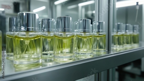 perfume, bottle, fragrance, cosmetic, luxury, shelf, glasses, liquid, product, cardboard box, design, beauty, silver, metal, modern, clean, clear, aesthetic, display, closeup, detail, stylish, contemporary, collection, row, lined, bright, light, yellow, amber, cosmetic, presentation, fragrant, essential, oil, wellness, spa, aromatherapy, retail, shop, store, commercial, elegant, minimalist, shiny, sharpened, brand