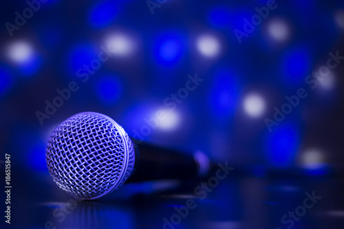 Close up of professional microphone with blue light effects - concert, karaoke, entertainment