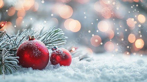 Close up of red Christmas ornaments on white snow covered pine branches with blurred background of bokeh lights and decorations.
