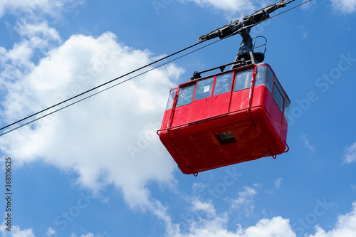 closeup, red, funicular, sky, old, waggon, move, along, cable car, sunny, weather, breathtaking, cableway, transportation, route, concept, trip, travel, journey, destination, vacation, tour, weekend, daytime, blue skies, cloud, wagon, electric, cable, trail, cabin, car, horizontal, outdoors
