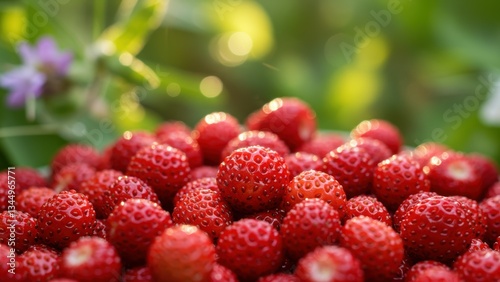 Close up of ripe red strawberries in a vibrant green outdoor setting Rich colors highlight freshness, ideal for summer cooking and healthy lifestyles