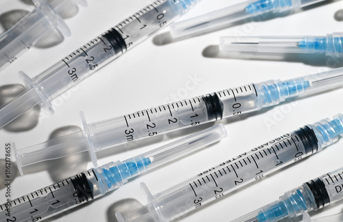 Close up of Single Use Syringes on White Background