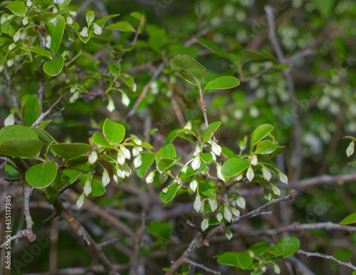 Close up of sparkleberry leaves and flower blooms (Vaccinium arboreum) on a branch; AKA Farkleberry, Huckleberry, Winter Huckleberry; small white blooms, Florida native