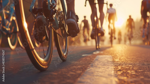 Close up of the wheels and shoes of a group of cyclists riding in a race