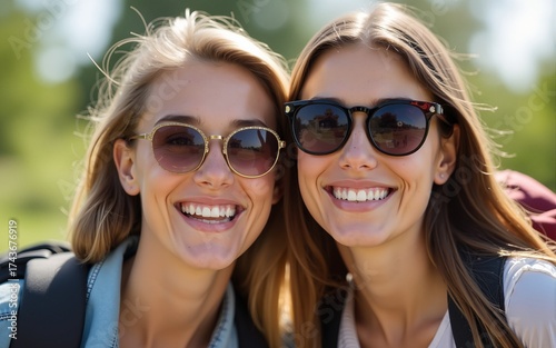 Close up of two young happy woman with sunglasses and backpack. High quality
