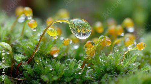 Close up of vibrant green moss with delicate raindrops forming on its surface, creating serene and refreshing scene. bright yellow capsules add touch of contrast and beauty