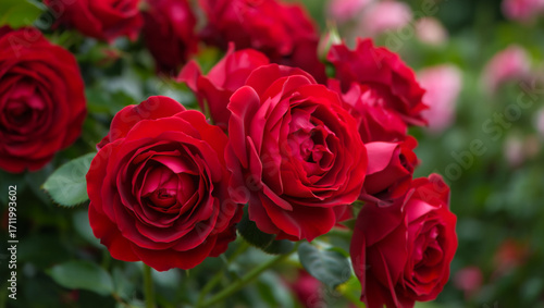 Close up of vibrant red roses blooming in a garden