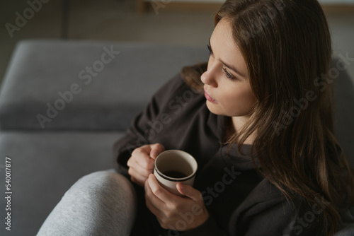 woman, cafes, home interior, indoor, female, relaxing, resting, caucasian, nostalgia, adult, people, serious, drinking, drink, cup, looking away, natural, holding, warming, 1, alone, thinking, dreaming, tranquilly, casual clothes, horizontal, lifestyle, copy space, mug, cosy, sitting