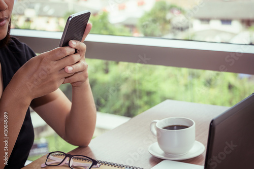 Close Up of woman hands using mobile phone and laptop computer with blank copy space screen for your advertising text message or content business in the Vintage effect.