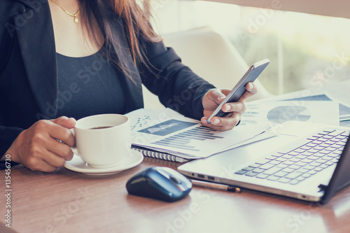 Close Up of woman hands using mobile phone and laptop computer with blank copy space screen for your advertising text message or content business in the Vintage effect.