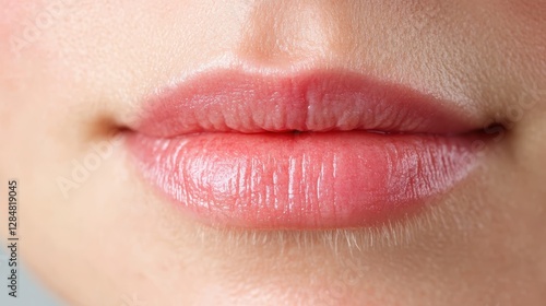 Close up of woman's lips wearing soft pink gloss, showcasing natural radiance, smooth skin, and delicate beauty with subtle, elegant highlighting