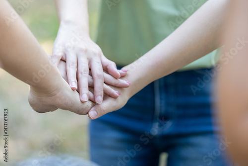 Close up of Young Asian woman hands team volunteer join hand, female volunteer team in park for charity event