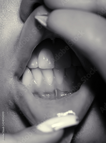 Close up of young female open mouth with nude lip make up. Attractive girl opens mouth with the help of her fingers with beautiful manicure. Checkup at doctor office. Different mouth disease.