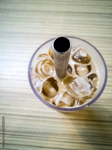 Close up on a tumbler glass full of iced coffee with a reusable metal drinking straw, on a wood restaurant table