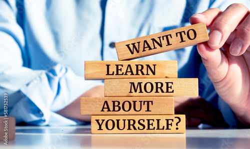 Close up on businessman holding a wooden block with "Want To Learn More About Yourself?" message