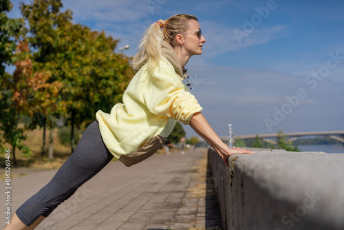 close up on the street on the river embankment in the city center on a concrete path a sporty girl in yellow sports suit healthy lifestyle warm-up imperfect figure