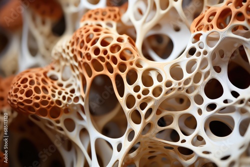 Close up organic of coral-like structures with porous textures and curling orange accents on a cream backdrop