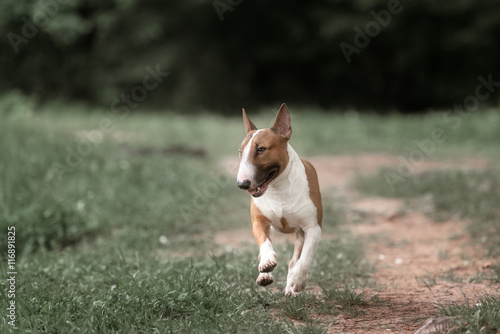Close Up Pet red Bullterrier Dog Portrait Indoor On nature Background