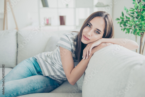 Close up photo beautiful amazing she her lady imaginary inspiration flight calm peaceful kindhearted easy-going wear striped t-shirt jeans denim sit comfort divan bright flat house living indoors