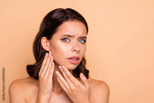 Close up photo beautiful amazing she her lady oh no disappointed facial expression hold hands arms facial skin terrible result using cream wear no clothes isolated beige pastel background