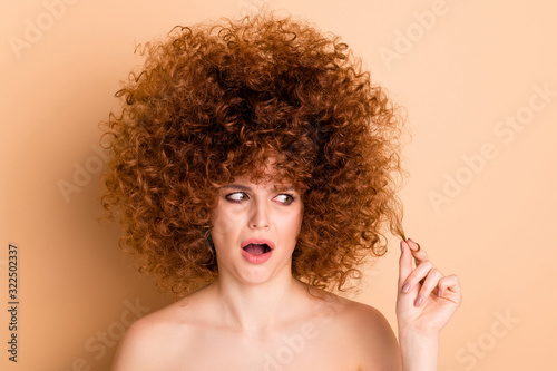 Close up photo beautiful she her wear no clothes nude lady displeased show stylist hairdo curls procedure stylist perms roller curlers tint wig terrible condition result isolated beige background