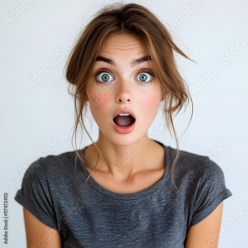 close up photo of beautiful woman with confused expression with two raised hands wearing t-shirt isolated in white studio
