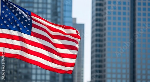 Close up photo of the united states flag waving during the day in bright sunlight with a background of tall buildings