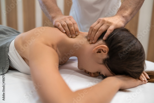 spa, massage, health care, indoor, relaxation, luxury, well-being, wellness, comfortable, lying, professional, body, couch, rehabilitation, recovering, hand, touching, expert, doctor