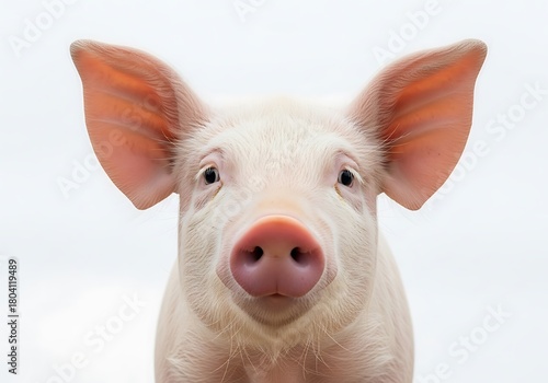 Close up portrait of a curious young pig with large ears and a pink snout against a white background